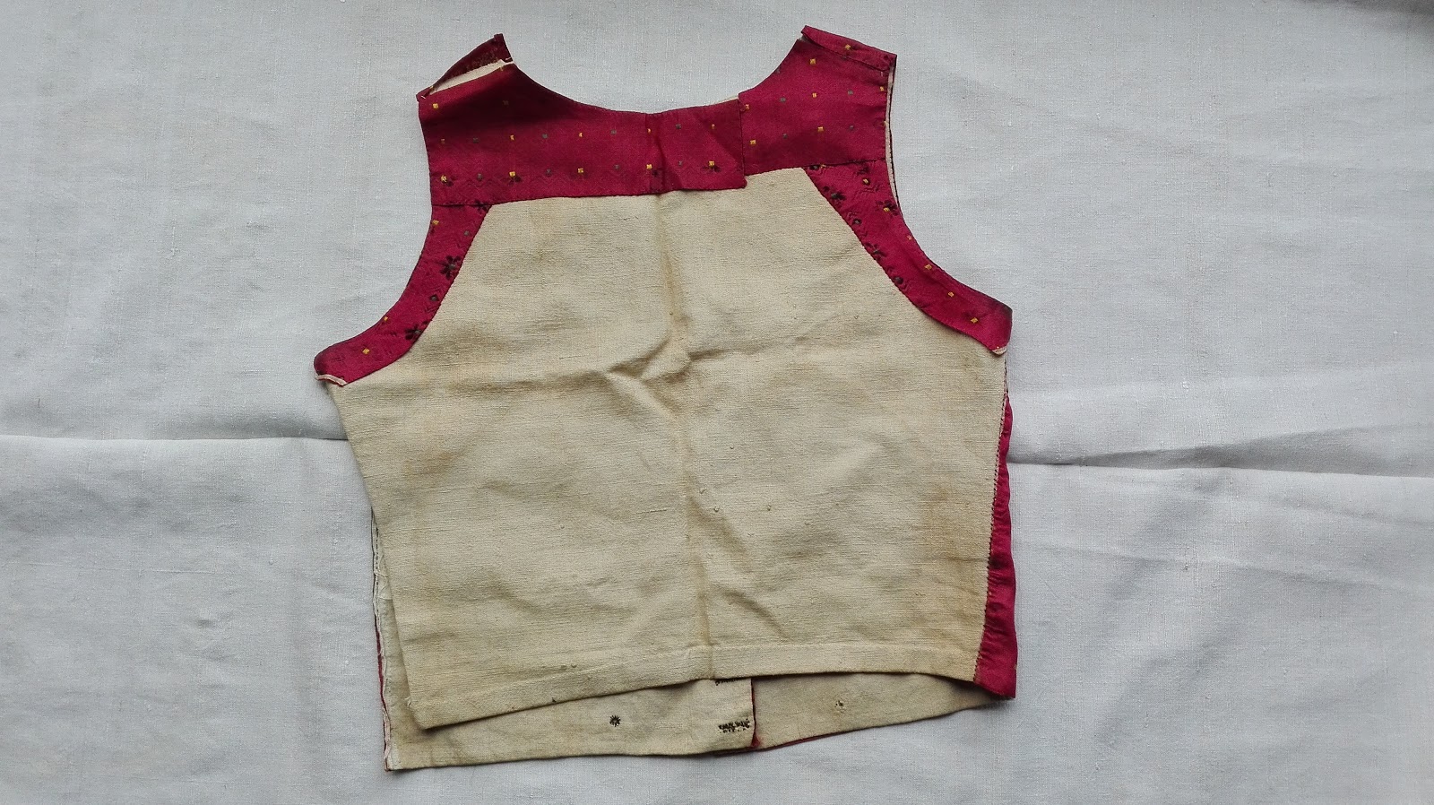 El jupetí va folrat també amb llenç, teixit que li dóna molta consistència a la subtil seda. No és fàcil trobar-ne en l'actualitat, però jo volia aconseguir una bona reproducció. No em conformava amb qualsevol textura.